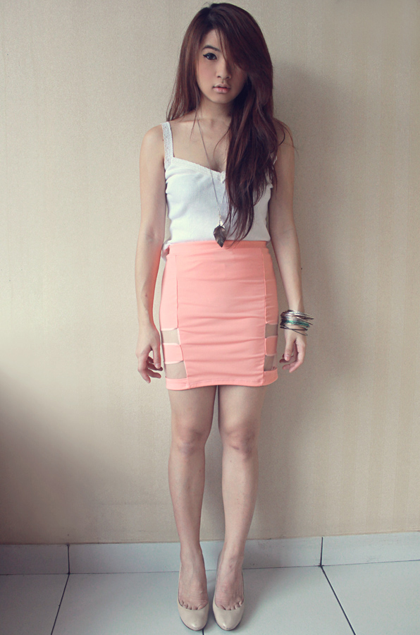 I was in the mood for pastel so I grabbed my pastel bandage skirt which is a gift that I got from my eldest sister (yes, ELDEST sister) and something soft to paired it with, my not so tall pumps.
